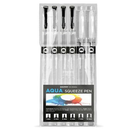 Pinceaux à réservoir Molotow Aqua Squeeze lot de 6 : Pinceau à réservoir en poils synthétiques, pointe souple d'une largeur 7mm. Remplissage facile, capacité : 8ml environ. Application simple et propre, modèle équipé d'un capuchon pour éviter le dessèchement de la pointe. Pour l'application de peinture fluide et d'encre