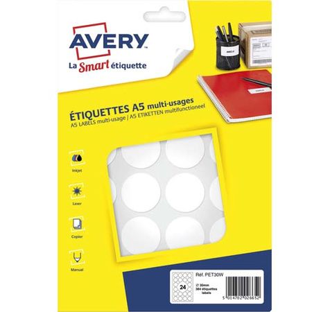 Compatible avec toute imprimante laser, jet d'encre, copieur. Idéale pour marquer vos documents : planning, inventaires, plans, etc. Feuille format A5 présentées sous sachet. Modèles et logiciels gratuits sur www.avery.fr