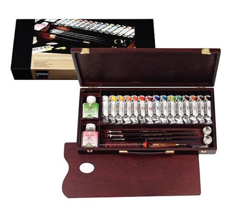 Ce coffret en bois 'Professional' inclut 15 tubes de 40 ml: Blanc de titane (105), Jaune de Naples rouge (224), Ocre jaune (227), Orange permanent (266), Jaune azo citron (267), Jaune azo moyen (269), Carmin (318), Rouge naphtol moyen (396), Terre d'ombre brûlée (409), Outremer (504), Bleu Brillant (564), Vert émeraude (615), Vert jaunâtre (617), Vert de vessie (623), Noir oxyde (735). Ce coffret inclut également: Médium acrylique mat Talens 75 ml, Vernis acrylique brillant Talens 75 ml, trois pinceaux: série 290 nos. 12, série 291 no. 6, série 292 no. 8 (fibre polyester, selected filament), un couteau à peindre no. 3012, un godet à palette double, un tube avec 3 bâtonnets de fusain, une palette en bois et une brochure sur le mélange de couleurs