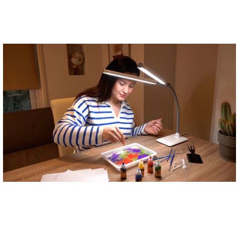 Doublez votre lumière et éliminez les ombres avec la lampe de table DuoPro. Que vous soyez en train de coudre, de faire de l’artisanat, de peindre ou de lire, profitez d’une excellente qualité de lumière et d’un rendu précis des couleurs grâce aux 56 LED lumière du jour de haute qualité de la DuoPro. La luminosité de chaque tube peut être réglée indépendamment de l’autre à l’aide du variateur tactile pratique. Facile à déplacer dans la maison ou à emporter avec vous en voyage. Cette lampe est dotée d’une double tête permettant d’augmenter la luminosité sur la surface de travail et d’un abat-jour anti-éblouissement à variateur tactile.