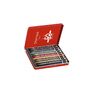 Boîte rouge en métal avec un nuancier à colorier présent à l'intérieur de chaque fourreau.