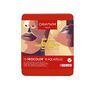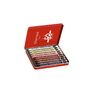 Boîte rouge en métal avec un nuancier à colorier présent à l'intérieur de chaque fourreau.