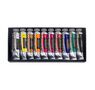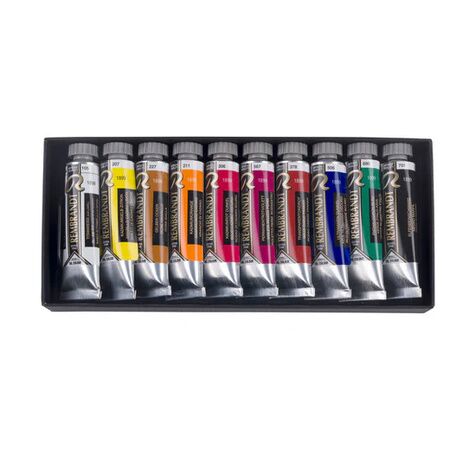 Contenu : 10 tubes de 15 ml (105 Blanc de titane (huile de carthame) – 207 Jaune de cadmium citron – 211 Orange de cadmium – 306 Rouge de cadmium foncé – 378 Rouge oxyde transparent – 227 Ocre jaune – 680 Vert phtalo bleuâtre – 567 Violet rougeâtre permanent – 506 Outremer foncé – 701 Noir d’ivoire).