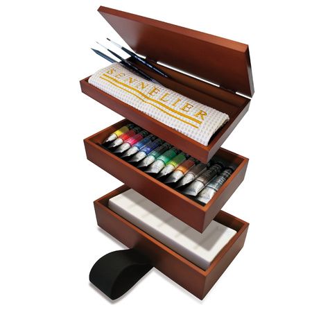 Un cadeau magnifique dans un conditionnement clin d'oeil aux grands peintres : pratique et prestigieux, il comblera tous les artistes !et: 12 10ml tubes, porcelain palette, embroidered Sennelier towel, graphite stick, 2 Softaqua brushes
