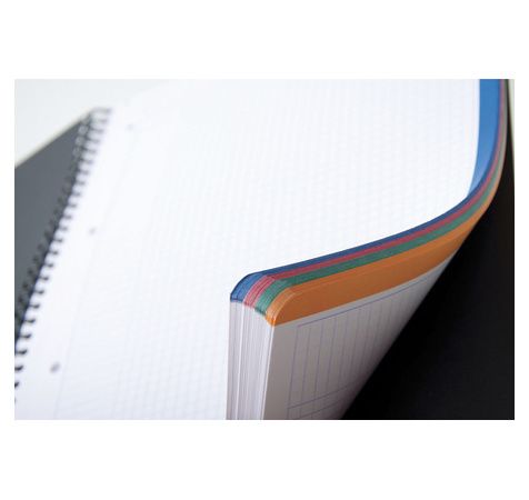 160 pages microperforées et perforées 4 trous. Couverture en carte enduite orange à spirale. Réglure quadrillée 5x5 avec marge et cadre en-tête. 4 bandes de couleurs sur le bord des pages pour 4 parties distinctes. Papier vélin surfin 80 g.