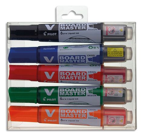 Pochette de 5 marqueurs VBoard Master Noir, bleu, rouge, vert et orange. Rechargeable. Pte biseauté