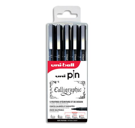 – Pochette de 5 stylos pointes calligraphie : pointes biseautées 1, 2, 3 mm, un stylo pointe 0,5 mm, un stylo pointe 0,1 mm.