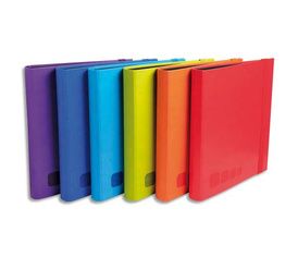 Couverture en simili cuir toucher velours. 18/10ème. Dos de 4 cm. Mécanisme à anneaux ronds Ø 30 mm. Fermeture par élastique vertical.