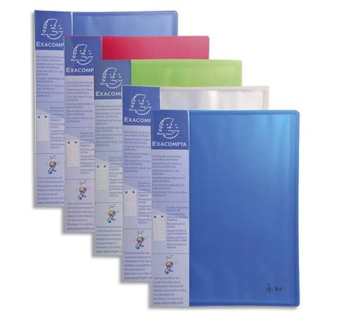 Couverture en polypropylène rigide 8/10ème. Pochettes intérieures cristal 5,5/100e, format A4. Classement en position verticale et horizontal. Porte étiquette 3 faces. Dimensions : 32 x 24 cm. Coloris assortis translucide : Bleu, rouge, vert, incolore.