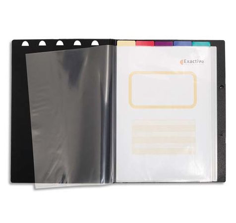 Couverture rigide en polypropylène 20/10ème opaque recyclé. Pochette pour CD et carte de visite en 3ème de couverture. Pochette intérieur en polypropylène cristal haute transparence 5/100e, format A4. Système de fermeture par élastique. Coloris noir. Livré avec un jeu de 5 intercalaires.
