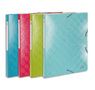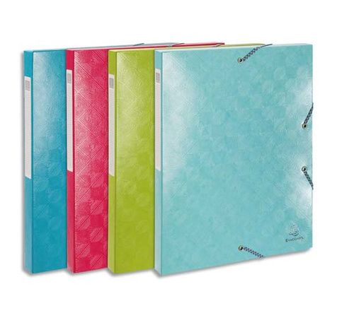 Dos 2,5 cm En carte lustrée pelliculée gaufrée 7/10e, 600 g. Fermeture par élastiques. Etiquette de dos adhésive. Dimensions : 25 x 33 cm. Pour format A4. Coloris assortis : Bleu tropique, framboise, bleu turquoise, vert anis. Assortis