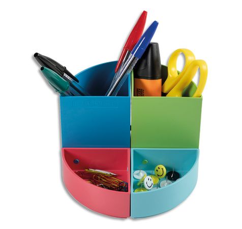 En polystyrène. 4 quartiers pouvant être combinés ensemble ou superposés pour gagner de la place et/ou cacher des objets (médicaments, jeton de machine à café, clé USB...). 2 compartiments hauts pour les grands ustensiles (ciseaux, stylos...) et 2 bas pour les petits objets (trombones, punaises...).