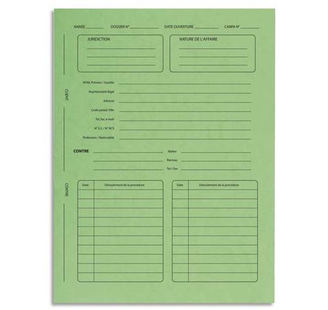Dossier imprimés en pages 1, 2 et 3 pour noter les coordonnées du client, le déroulement de la préocédure, le temps passé, la juridiction, nature de l'affaire, cordonnées client, partie contre, déroulement procédure, frais et honoraires, etc.