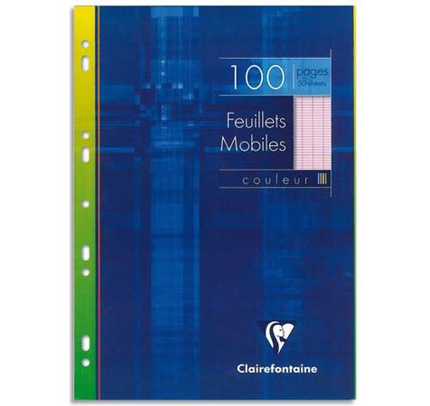 Pages perforées 9 trous (format A4) ou perforation 2 trous (format 17 x 22 cm), conditionnées dans un étui cartonné. Réglure grands carreaux Seyès. Papier vélin velouté 90 g certifié PEFC. Feuilles assorties ou à la couleur.