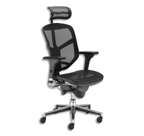 Assise, dossier et têtière en résille. Mécanisme Synchrone, mouvement synchronisé de l'assise et du dossier. Réglable en tension et multiblocable. Dossier réglable en hauteur 12 cm et assise en profondeur 6 cm. Têtière ajustable en hauteur 8 cm et en inclinaison. Piètement 5 branches en fonte d'aluminium bi-teinté noir et chrome. Accoudoirs 3D fournis réglables en hauteur 9 cm, orientation angle manchette et avant-arrière. Mécanisme synchrone.