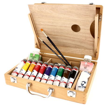 Ce set général de base en boîte de bois clair inclut 10 tubes de 40 ml des couleurs suivantes : Blanc de titane (105), Jaune azo clair (268), Jaune azo foncé (270), Rouge naphtol moyen (396), Rose quinacridone (366), Bleu outremer (504), Bleu brillant (564), Vert permanent foncé (619), Terre d'ombre brûlée (409), Noir oxyde (735).