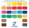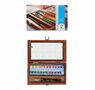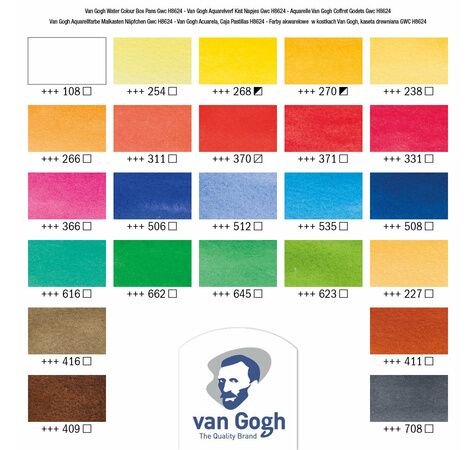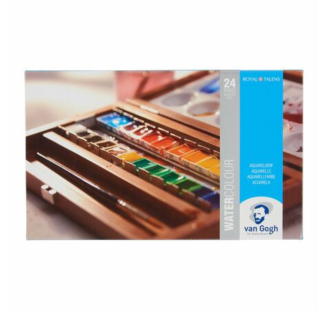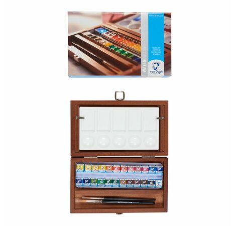Coffret en bois Van Gogh contenant 24 demi-godets, 2 pinceaux Van Gogh série 191 n°6 (modèle pointu, rond, fibre polyester) et série 195 n°8 (modèle rond, poil martre rouge), plateau mélangeur en métal.